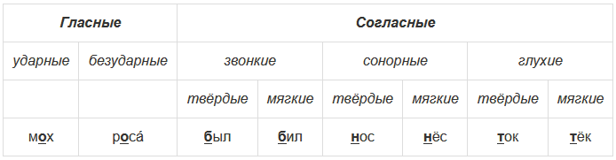 | удар-ные | безу-дарные | звонкие | сонорные | глухие | |||