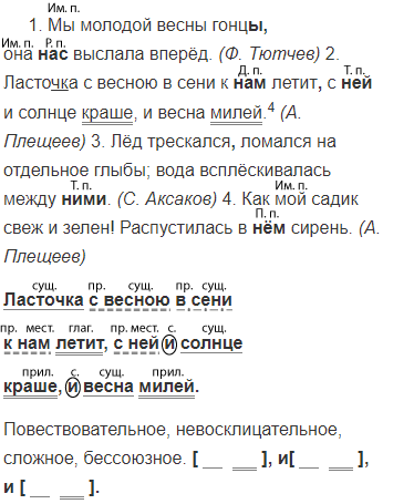 1. Мы молодой весны гонц.. она (мы) выслала вперёд. (Ф. Тютчев) 2. Ласточ(?)ка с весною в сени6 к (мы) летит с (она) и солнце краше, и весна милей.4 (А. Плещеев) 3. Лёд трескался ломался на отдельное глыбы; вода всплёскивалась между (они). (С. Аксаков) 4. Как мой садик свеж и зелен! Распустилась в (он) сирень. (А. Плещеев)