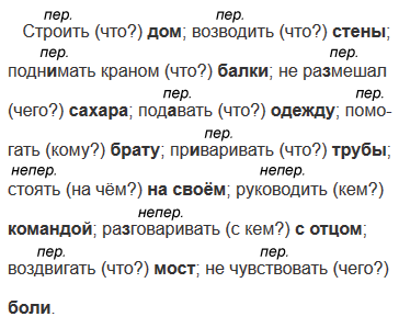 Строить (что?); возводить (что?); подн..мать краном (что?); не ра(з, с)мешал (чего?); под..вать (что?); пом..гать (кому?); пр..варивать (что?); стоять (на чём?); руководить (кем?); ра(з, с)говаривать (с кем?); воздвигать (что?); не чувствовать (чего?).
