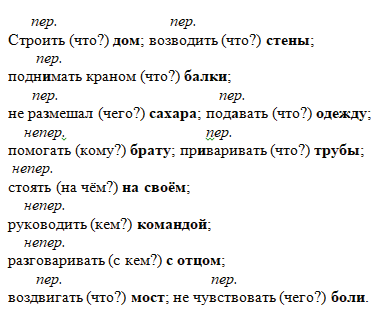 Строить (что?); возводить (что?); подн..мать краном (что?); не ра(з, с)мешал (чего?); под..вать (что?); пом..гать (кому?); пр..варивать (что?); стоять (на чём?); руководить (кем?); ра(з, с)говаривать (с кем?); воздвигать (что?); не чувствовать (чего?).