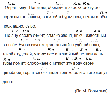 По дну оврага б..жит, сладко звеня, ключ(?)6, извес(?)ный во всём Буеве вкусом кр..стальной студёной воды, такой студёной, что (от)неё и в знойный летний день зубы лом..т; слобожане считают эту воду своей, ц..лебной, гордят(?)ся ею, п(?)ют только её и оттого ж..вут долго.