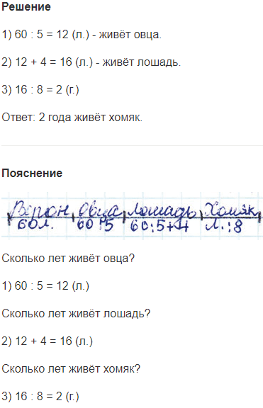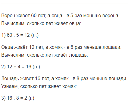 Задание № 43. Ворон живёт 60 лет, а овца - в 5 раз меньше ворона. Лошадь живёт на 4 года больше овцы, а хомяк - в 8 раз меньше лошади. Сколько лет живёт хомяк?