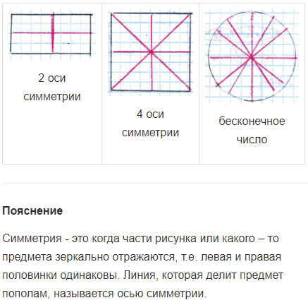 б) Сколько осей симметрии имеют прямоугольник, квадрат, круг? Построй их и укажи ось симметрии.