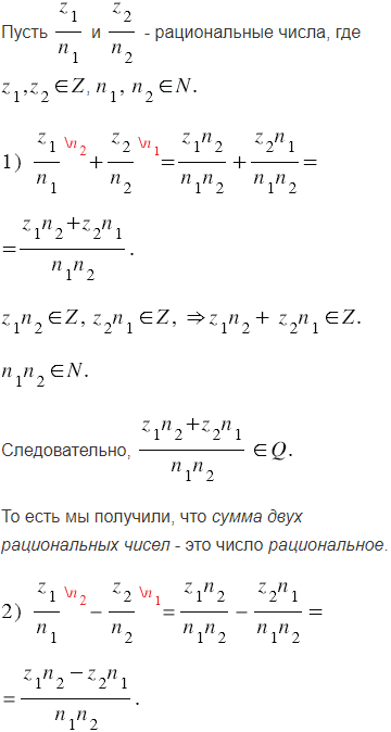 Докажите, что сумма разность, произведение и частное двух рациональных чисел является рациональными числами.