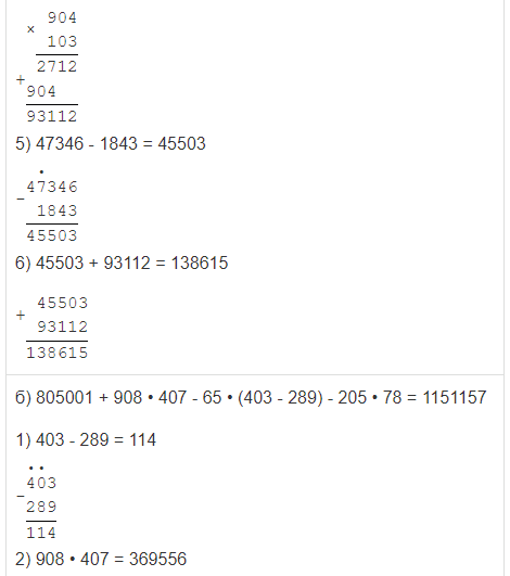 | б) 805001 + 908 • 407 - 65 • (403 - 289) - 205 • 78 |