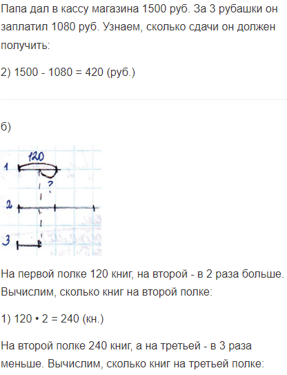 а) Папа дал в кассу магазина 1500 руб. в уплату за 3 рубашки по цене 360 руб. Сколько сдачи он должен получить?