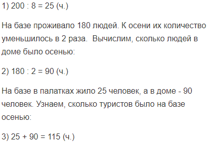 в) На туристической базе летом проживало 200 человек в палатках и 180 человек в доме. К осени число людей в палатках уменьшилось в 8 раз, а в доме - в 2 раза. Сколько туристов было на базе осенью?