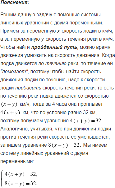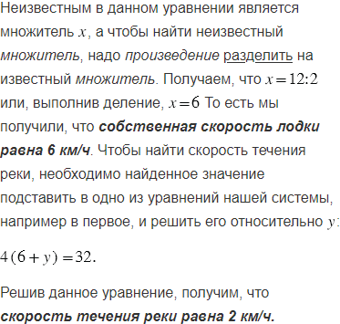 Лодка проплыла 32 км по течению реки за 4 ч, а против течения - за 8 ч. Найдите собственную скорость лодки и скорость течения реки.