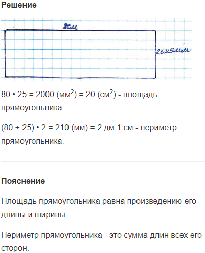 Задание № 6. Построй прямоугольник со сторонами 8 см и 2 см 5 мм. Найди его периметр и площадь.