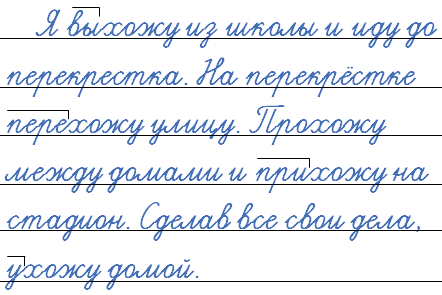 Слова для выбора: выхожу (из школы), перехожу (улицу), прихожу (на стадион), ухожу (домой).
