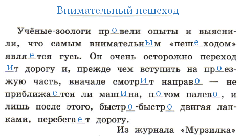 Учёные-зоологи пр_вели опыты и выяснили, что самым внимательн_м "пеш_ходом" явля_тся гусь. Он очень осторожно переход_т дорогу и, прежде чем вступить на пр_езжую часть, вначале смотр_т направ_ - не приближа_тся ли маш_на, п_том налев_, и лишь после этого, быстр_-быстр_ двигая лапками, перебега_т дорогу.