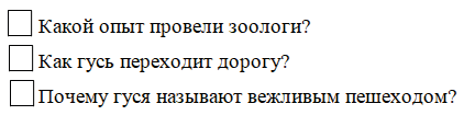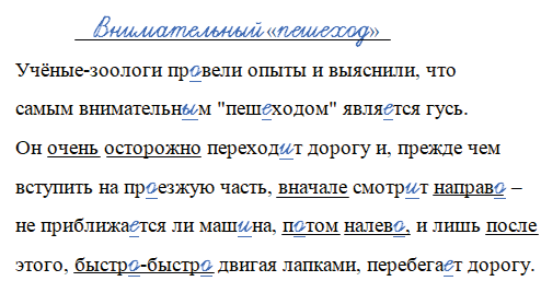 Учёные-зоологи пр_вели опыты и выяснили, что самым внимательн_м "пеш_ходом" явля_тся гусь. Он очень осторожно переход_т дорогу и, прежде чем вступить на пр_езжую часть, вначале смотр_т направ_ - не приближа_тся ли маш_на, п_том налев_, и лишь после этого, быстр_-быстр_ двигая лапками, перебега_т дорогу.