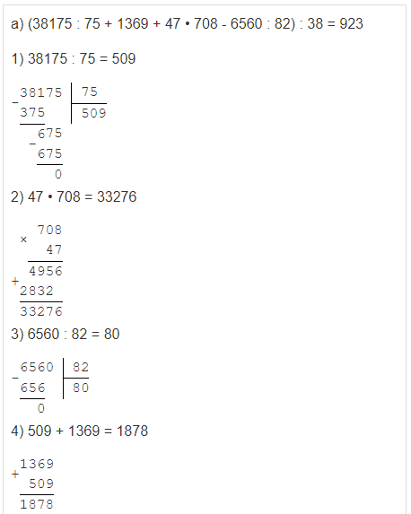 | а) (38175 : 75 + 1369 + 47 • 708 - 6560 : 82) : 38; |