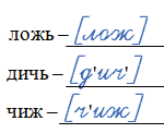 В словах ложь, чиж в транскрипции звук [ж] пишем без мягкости, потому что он всегда твёрдый. В слове дичь необходимо поставить знак мягкости после звука [ч'], потому что он всегда мягкий.