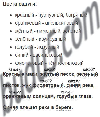 Имена прилагательные, обозначающие цвета радуги: красный, оранжевый, жёлтый, зелёный, голубой, синий, фиолетовый.