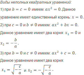 Какие существуют виды неполных квадратных уравнений? Какие корни имеет уравнение каждого вида?