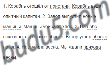 1. Корабль отошёл от пристани. Корабль ведёт опытный капитан. 2. Завод выпустил новые машины. Машины убирают хлеб. 3. На небе показалось грозовое облако. Ветер угнал облако на юг. 4. Наступила весна. Мы ждали прихода весны.