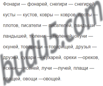 Фонари — фонарей, снегири, кусты, ковры, плоты, писатели, ландыши, тюлени, окуни, товарищи, друзья, сухари, орехи, ясени, лучи, плащи, овощи.