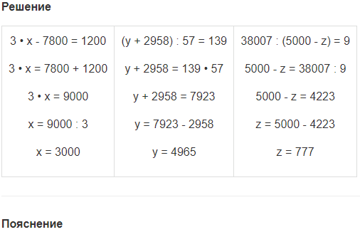 | 3 • х - 7800 = 1200 | (у + 2958) : 57 = 139 | 38007 : (5000 - z) = 9 |