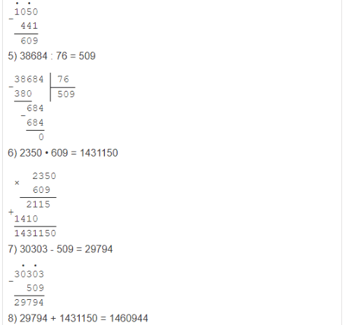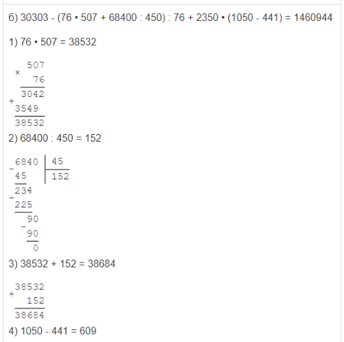 | б) 30303 - (76 • 507 + 68400 : 450) : 76 + 2350 • (1050 - 441). |