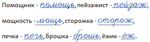 Помощник – помощь, пейзажист – пейзаж, мощность – мощь, сторожка – сторож, печка – печь, брошка – брошь, ёжик – ёж.