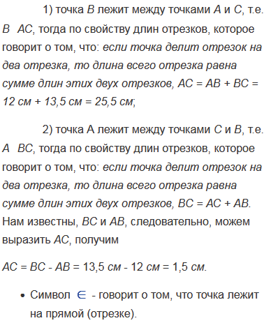 Точки А, В и С лежат на одной прямой. Известно, что АВ = 12 см, ВС = 13,5 см. Какой может быть длина отрезка АС?