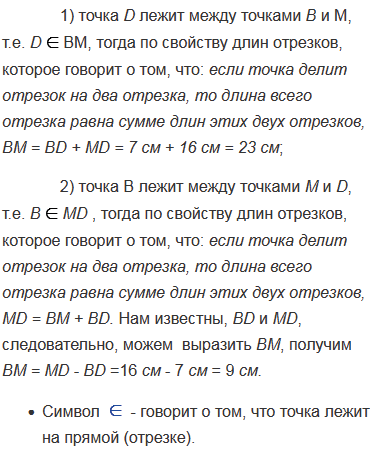 Точки B, D и М лежат на одной прямой. Известно, что BD = 7 см, MD = 16 см. Каким может быть расстояние ВМ?