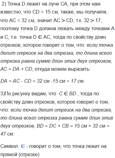 Точка С - середина отрезка АВ, равного 64 см. На луче СА отмечена точка D так, что CD = 15 см. Найдите длины отрезков ВD и DА.