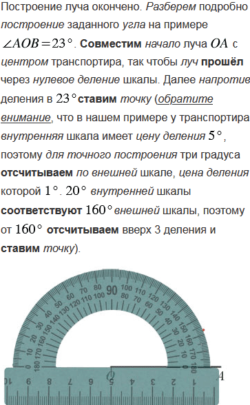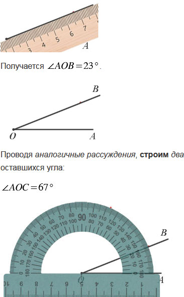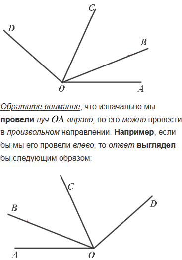 Начертите луч OA и с помощью транспортира отложите от луча OA углы AOB, AOC и AOD так, чтобы