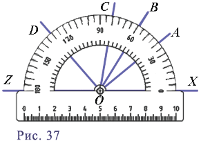 На рисунке 37 изображены лучи с общим началом O. а) Найдите градусные меры углов AOX, BOX, AOB, COB, DOX; б) назовите углы равные 20