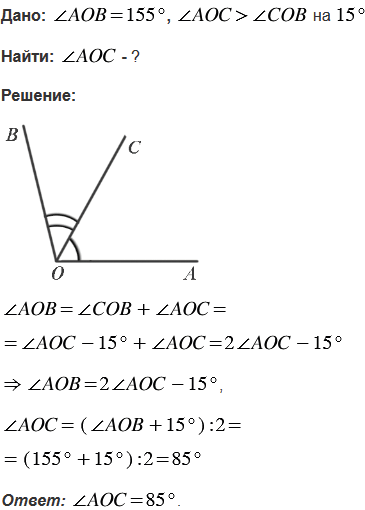 Луч OC делит угол AOB на два угла. Найдите угол AOC, если AOB = 155, а угол AOC на 15 больше угла COB.