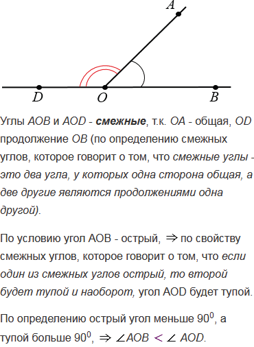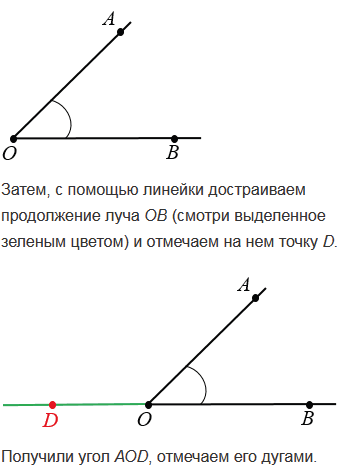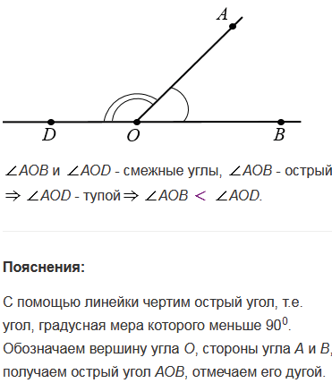 Начертите острый угол АОВ и на продолжении луча ОВ отметьте точку D. Сравните углы АОВ и АОD.