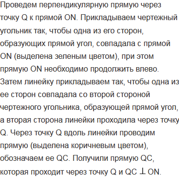 Начертите неразвернутый угол MON  и отметьте точку Р внутри угла и точку Q - вне его. С помощью чертежного угольника и линейки через точки Р и Q проведите прямые, перпендикулярные к прямым OM и ON.
