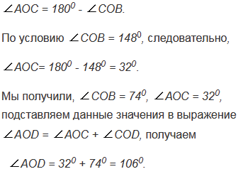 На рисунке 52 углы BOD и COD равны. Найдите угол AOD, если COB = 1480.