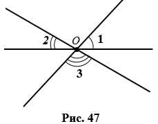 На рисунке 47 изображены три прямые, пересекающиеся в точке О. Найдите сумму углов: 1 +2 +3.