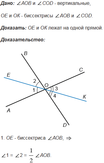 Докажите, что биссектрисы вертикальных углов лежат на одной прямой.