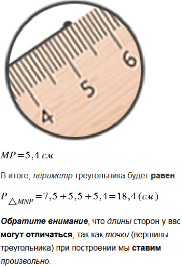 Начертите треугольник и обозначьте его вершины буквами M, N и P. а) Назовите все углы и стороны треугольника; б) с помощью масштабной линейки измерьте стороны и найдите периметр треугольника.