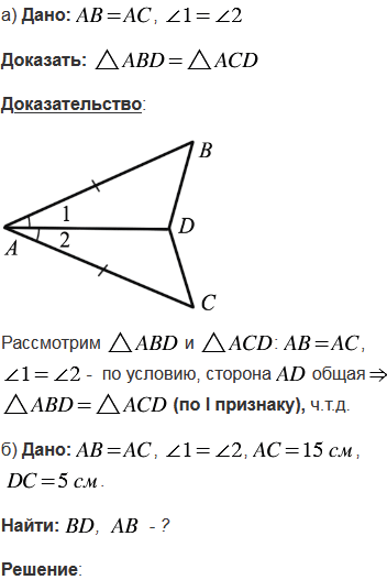 2. а) Докажите, что треугольники ABD и ACD равны; б) найдите BD и AB, если AC = 15 см, DC = 5 см.