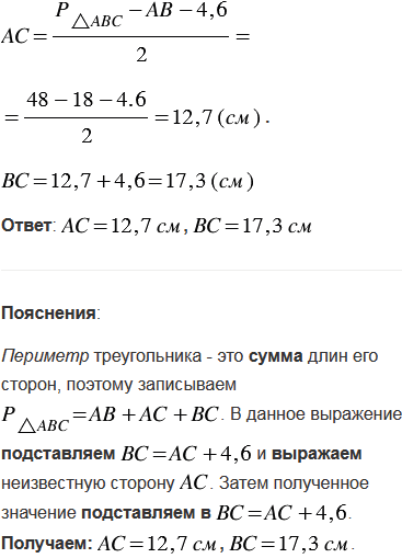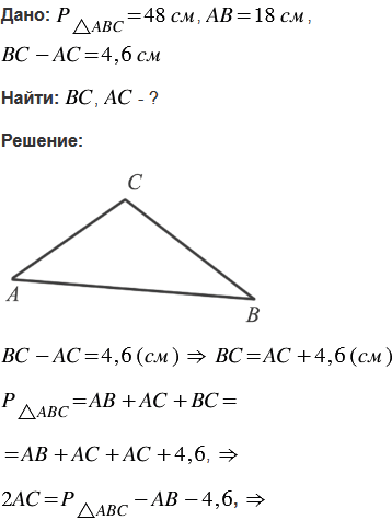 Периметр треугольника равен 48 см, а одна из сторон равна 18 см. Найдите две другие стороны,если их разность равна 4,6 см.
