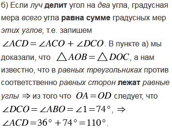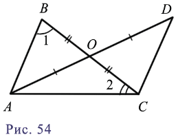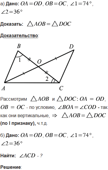 На рисунке 54 OA = OD, OB = OC, 1 = 74, 2 = 36. а)  Докажите, что треугольник AOB и DOC равны; б) найдите ACD.