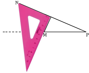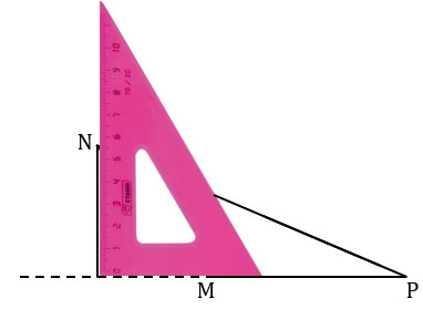 Далее из вершины P проводим прямую вдоль стороны угольника к продолжению стороны MN треугольника MNP.