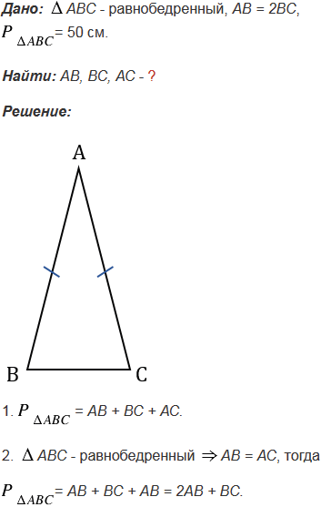 В равнобедренном треугольнике основание в два раза меньше боковой стороны, а периметр равен 50 см. Найдите стороны треугольника.