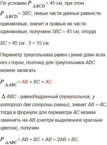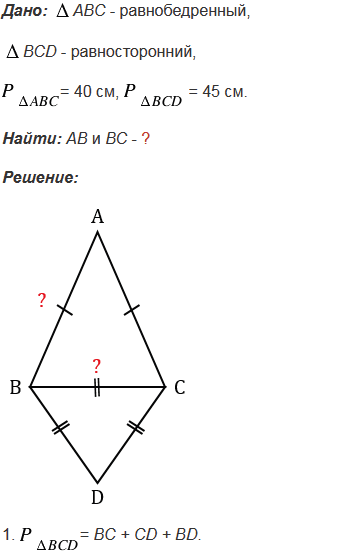 Периметр равнобедренного треугольника АВС с основанием ВС равен 40 см, а периметр равностороннего треугольника ВСD равен 45 см. Найдите стороны АВ и ВС.
