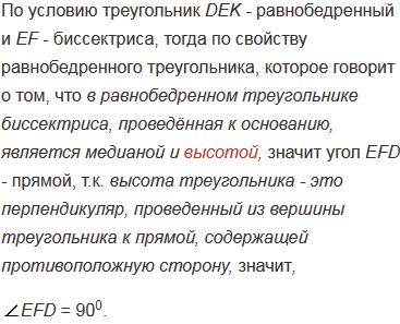 В равнобедренном треугольнике DEK с основанием DK = 16 см отрезок EF - биссектриса,