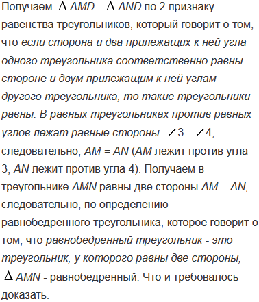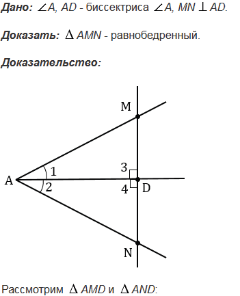 Прямая, перпендикулярная к биссектрисе угла A, пересекает стороны угла в точках M и N. Докажите, что треугольник AMN - равнобедренный.