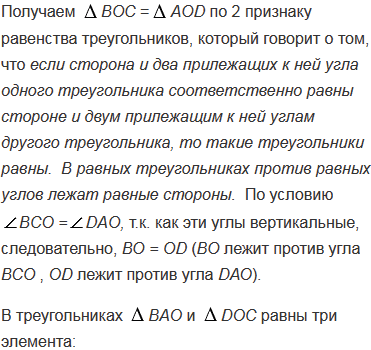 Отрезки AC и BD пересекаются в середине отрезка AC, точке О,