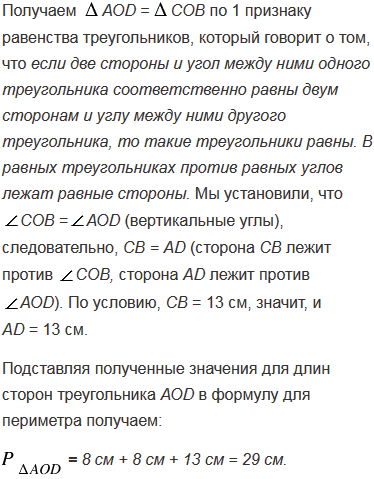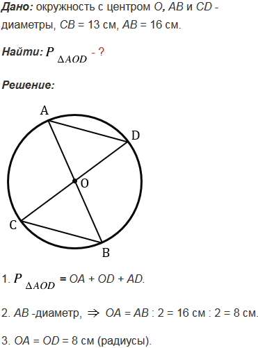 Отрезки АВ и СD - диаметры окружности с центром О. Найдите периметр треугольника АОD, если известно, что СВ = 13 см, АВ = 16 см.