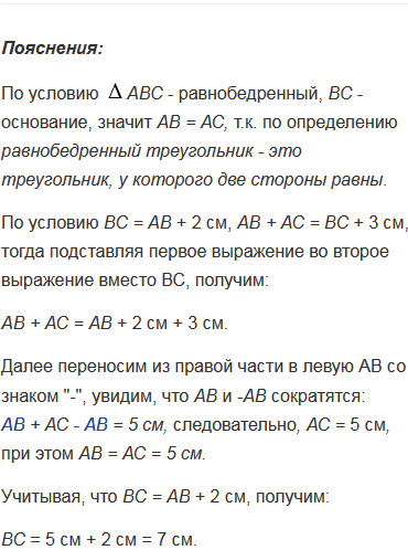 В равнобедренном треугольнике основание больше боковой стороны на 2 см, но меньше суммы боковых его сторон на 3 см. Найдите стороны треугольника.