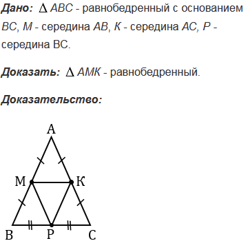 Докажите, что середины сторон равнобедренного треугольника являются вершинами другого равнобедренного треугольника.