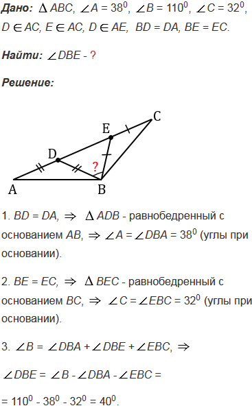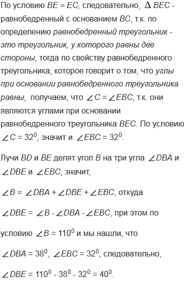 С = 320. На стороне АС отмечены точки D и Е так, что точка D лежит на отрезке АE, BD = DA, ВE = EC. Найдите угол DBE.